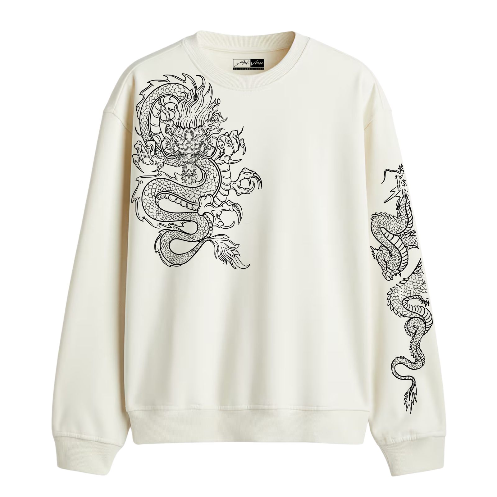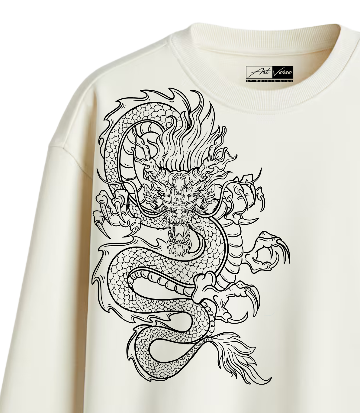 A premium cream sweatshirt featuring bold drawn dragon artwork on the chest and sleeve. Soft, durable fabric with a relaxed fit—perfect for streetwear lovers who want standout style without trying too hard.